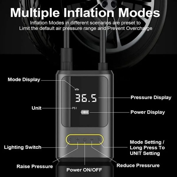 بادکننده لاستیک شارژی با 4 حالت باد از پیش تعیین شده برای باد کردن دوچرخه، موتور سیکلت، اتومبیل و توپ، به طور خودکار با رسیدن به مقدار از پیش تعیین شده متوقف می شود، استفاده آسان برای مبتدیان.